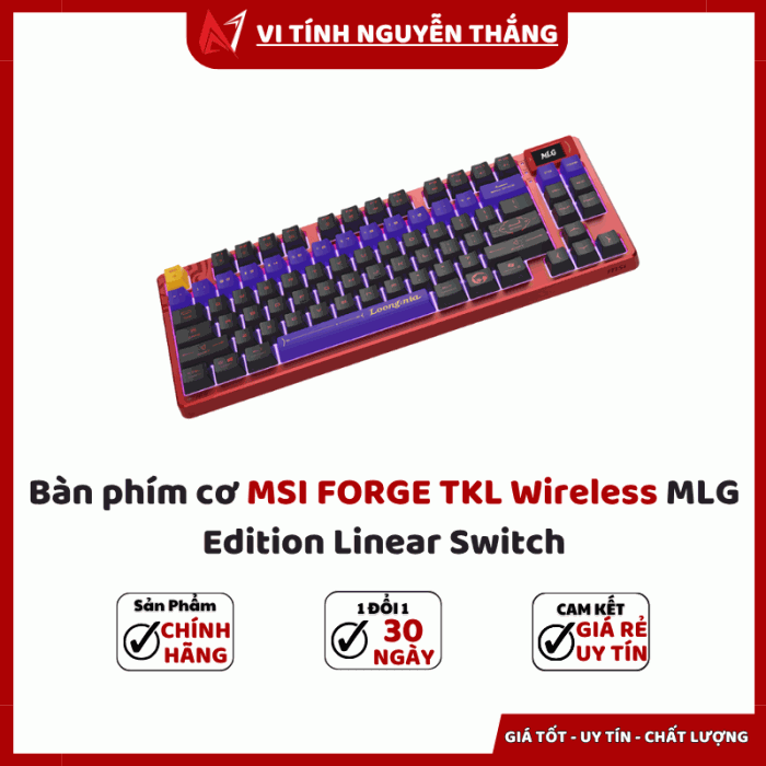 Trong thế giới gaming, bàn phím cơ không chỉ là công cụ nhập liệu mà còn là “vũ khí” quyết định tốc độ và trải nghiệm chơi game. MSI FORGE TKL Wireless MLG Edition với switch cơ học tuyến tính KTT Purple Star Linear mang đến cảm giác gõ mượt mà, độ bền vượt trội và khả năng kết nối linh hoạt. Đây là dòng bàn phím gaming TKL (Tenkeyless) hiện đại, được thiết kế cho game thủ chuyên nghiệp và người dùng yêu thích sự gọn gàng nhưng vẫn mạnh mẽ.