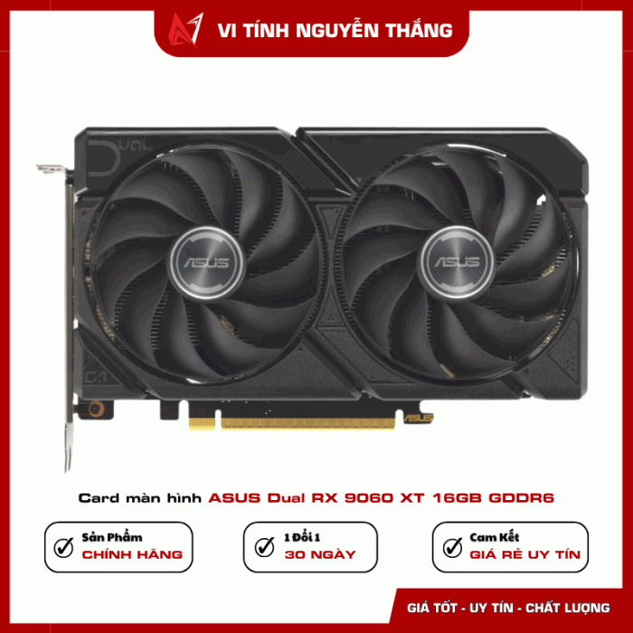 Card màn hình ASUS Dual RX 9060 XT 16GB GDDR6 là dòng VGA thế hệ mới hướng đến người dùng cần hiệu năng cao cho gaming hiện đại và các tác vụ đồ họa chuyên sâu. Sản phẩm được xây dựng dựa trên nền tảng GPU Radeon RX 9000 series, mang lại khả năng xử lý mạnh mẽ cùng nhiều cải tiến về hiệu suất.