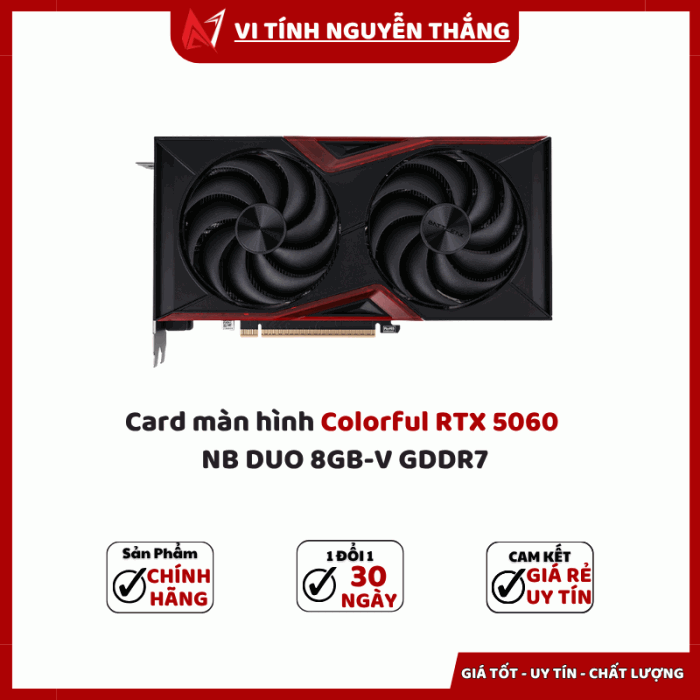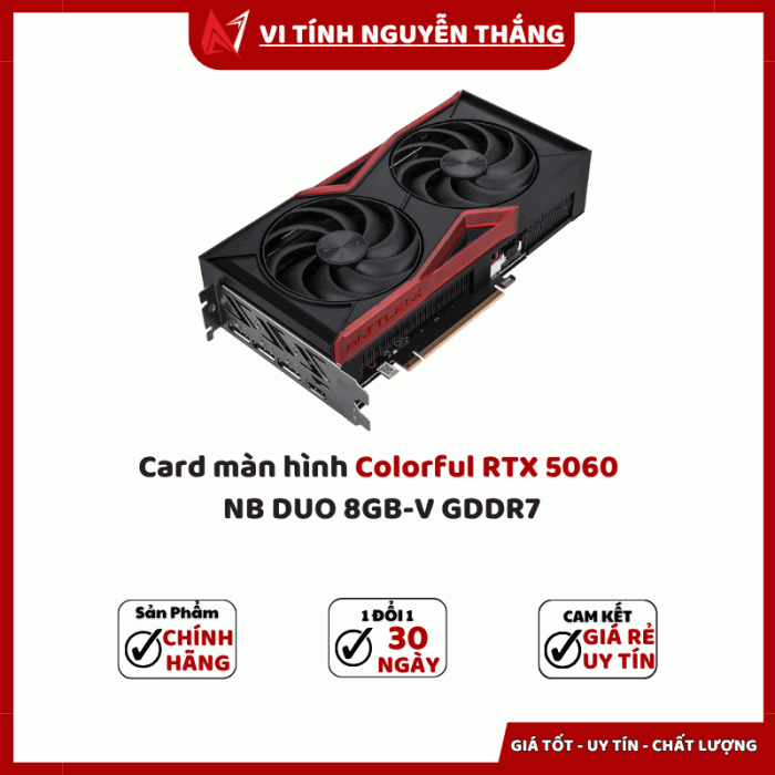 Trong thế hệ card đồ họa mới, Card màn hình Colorful RTX 5060 NB DUO 8GB-V GDDR7 nổi bật nhờ sự cân bằng giữa hiệu năng mạnh mẽ, công nghệ tiên tiến và mức giá hợp lý. Đây là dòng card được thiết kế dành cho game thủ, nhà thiết kế đồ họa và người làm nội dung muốn trải nghiệm mượt mà ở độ phân giải cao và tận dụng sức mạnh AI cùng Ray Tracing thế hệ mới.