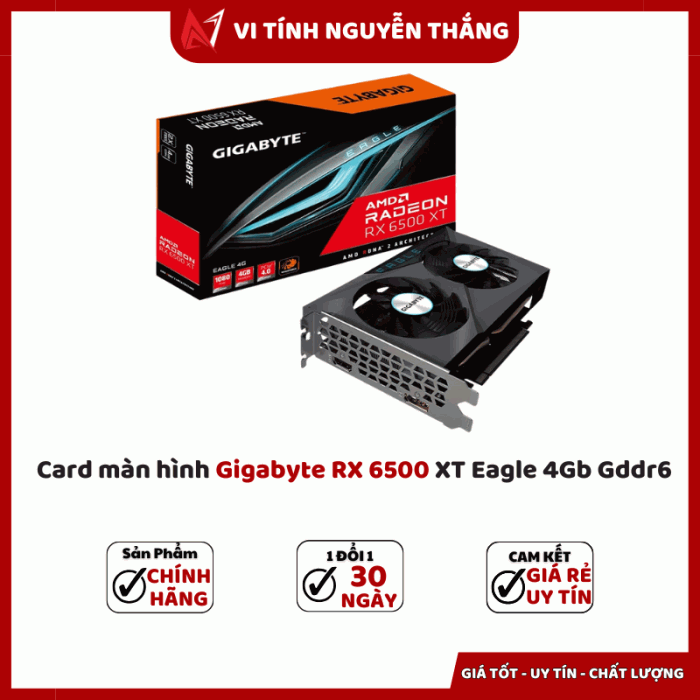 Trong phân khúc card màn hình tầm trung – giá rẻ, Gigabyte RX 6500 XT Eagle 4GB GDDR6 là một lựa chọn nổi bật cho game thủ và người dùng văn phòng. Với thiết kế tản nhiệt kép WindForce, bộ nhớ GDDR6 tốc độ cao và hiệu năng đủ sức chiến các tựa game eSports hay AAA ở độ phân giải Full HD, sản phẩm mang đến trải nghiệm mượt mà mà vẫn tiết kiệm chi phí.