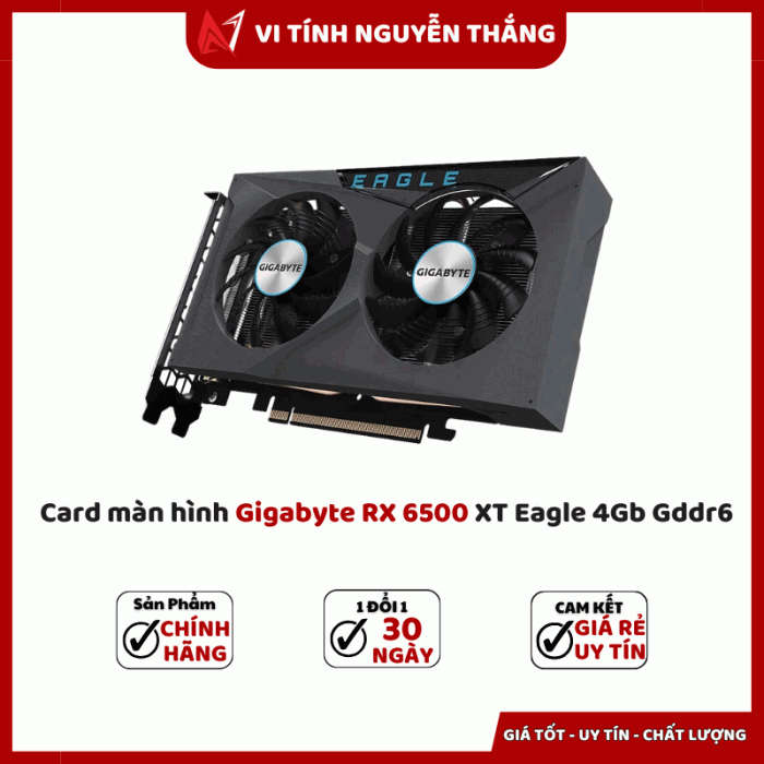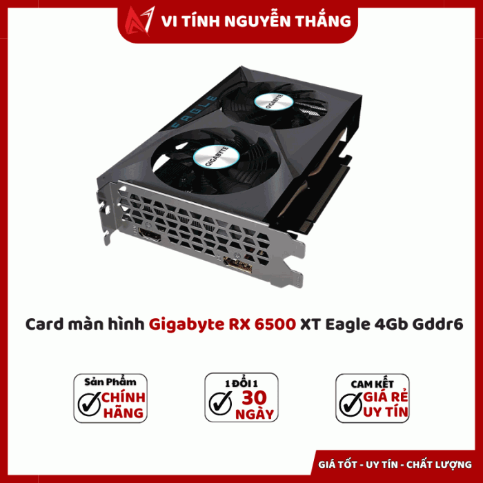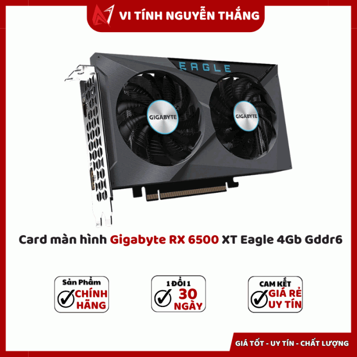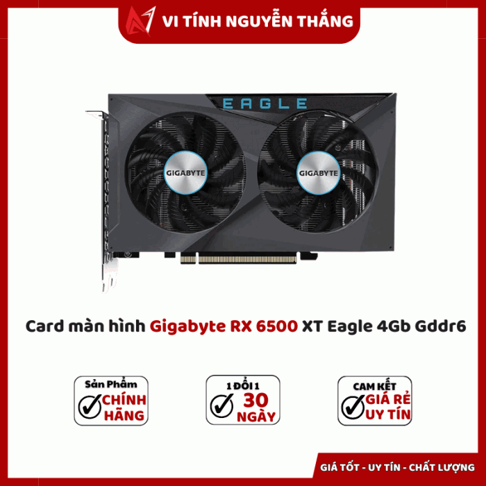 Card màn hình Gigabyte RX 6500 XT Eagle 4GB GDDR6 là lựa chọn lý tưởng cho người dùng muốn nâng cấp PC gaming hoặc làm việc đồ họa cơ bản với chi phí tiết kiệm. Với thiết kế tản nhiệt WindForce, bộ nhớ GDDR6 và hiệu năng ổn định ở độ phân giải Full HD, đây là chiếc VGA phổ thông đáng mua trong tầm giá.
