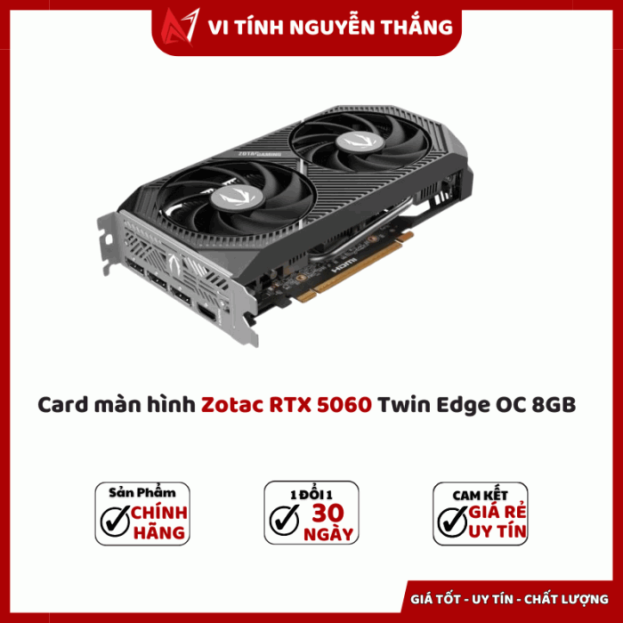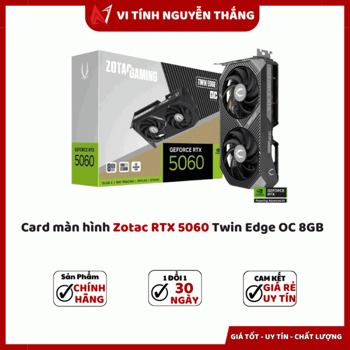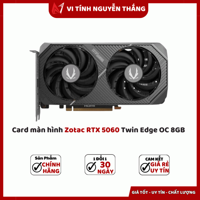 Card màn hình Zotac RTX 5060 Twin Edge OC 8GB là lựa chọn lý tưởng cho game thủ và người dùng sáng tạo nội dung cần một GPU hiệu năng ổn định – hỗ trợ công nghệ mới – thiết kế gọn nhẹ. Với mức giá dễ tiếp cận, đây là dòng card đồ họa đáng cân nhắc trong phân khúc tầm trung năm 2025.