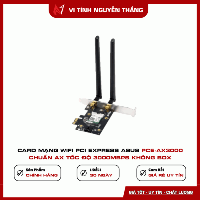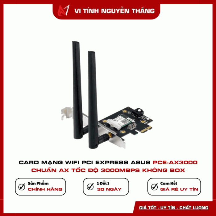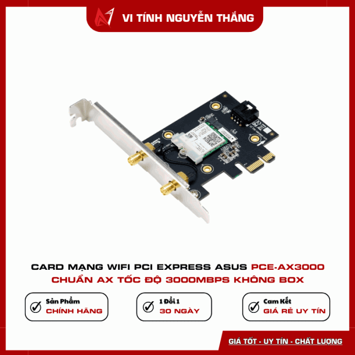 Card mạng WiFi PCI Express ASUS PCE-AX3000 là lựa chọn lý tưởng cho người dùng cần kết nối không dây tốc độ cao, ổn định và hiện đại. Sản phẩm phù hợp cho gaming, làm việc online và giải trí đa phương tiện.