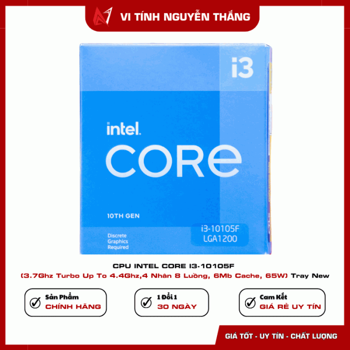 Intel Core i3-10105F là bộ vi xử lý thuộc dòng Core i thế hệ thứ 10, hướng đến người dùng phổ thông cần hiệu năng ổn định cho gaming, làm việc văn phòng, học tập và giải trí. Với 4 nhân 8 luồng cùng xung nhịp cao, i3-10105F vẫn đáp ứng tốt nhiều tác vụ hiện nay.