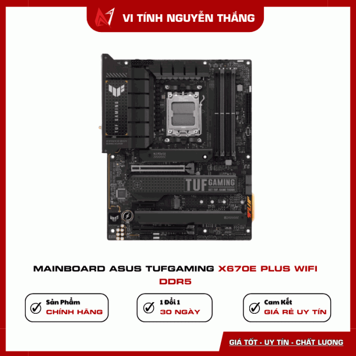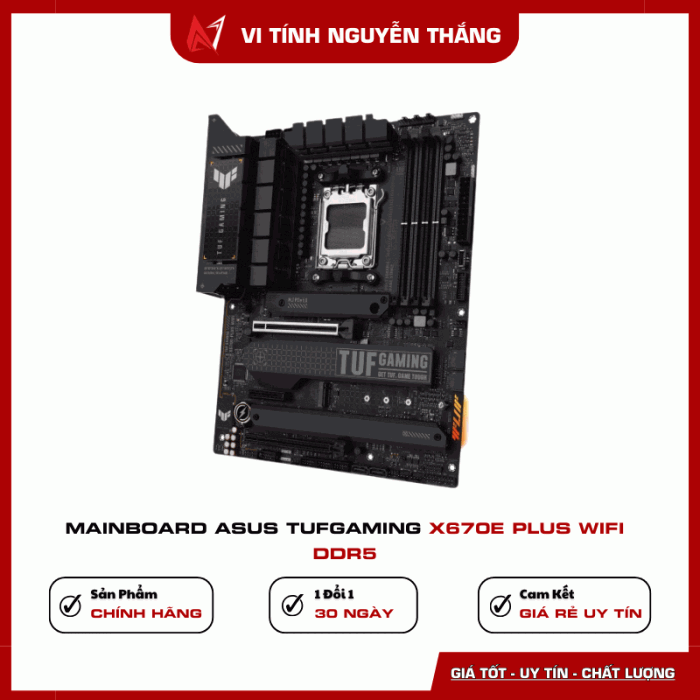 Mainboard ASUS TUF Gaming X670E-PLUS WIFI DDR5 là bo mạch chủ cao cấp dành cho nền tảng AMD Ryzen thế hệ mới, sử dụng chipset X670E mạnh mẽ, hỗ trợ RAM DDR5, PCIe 5.0 cùng kết nối WiFi 6 hiện đại, đáp ứng hoàn hảo cho PC gaming và workstation hiệu năng cao.
