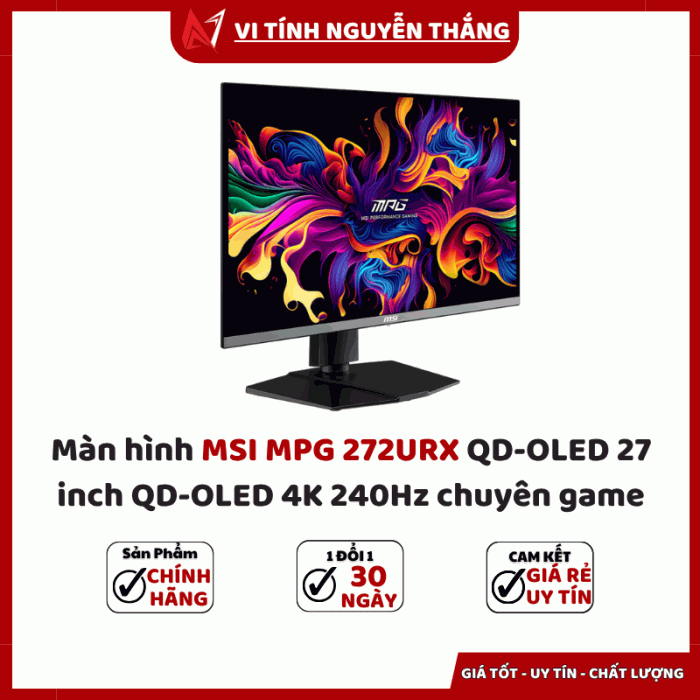 Màn hình MSI MPG 272URX QD-OLED là siêu phẩm mới trong dòng màn hình gaming cao cấp của MSI, sở hữu tấm nền QD-OLED hiện đại, độ phân giải 4K UHD, cùng tần số quét 240Hz siêu mượt. Với thời gian phản hồi 0.03ms, công nghệ HDR True Black 400 và gam màu rộng gần 100% DCI-P3, sản phẩm này được thiết kế để đáp ứng nhu cầu game thủ eSports chuyên nghiệp, streamer và nhà sáng tạo nội dung.