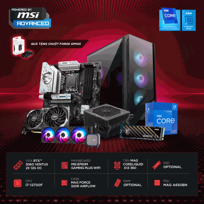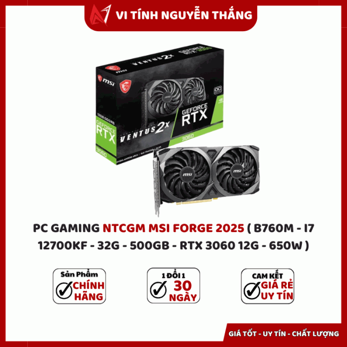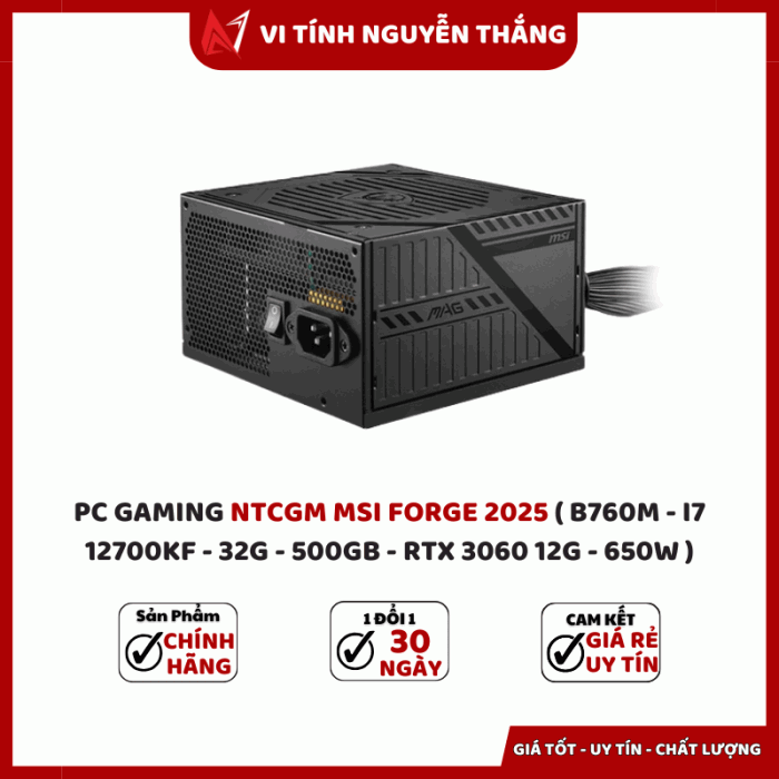 Với cấu hình mạnh mẽ, hiệu suất ổn định và khả năng đáp ứng đa dạng nhu cầu, PC GAMING NTCGM MSI FORGE 2025 (i7-12700KF | RTX 3060 12GB) chính là lựa chọn lý tưởng cho game thủ, streamer và designer cần một dàn PC đáng tin cậy.