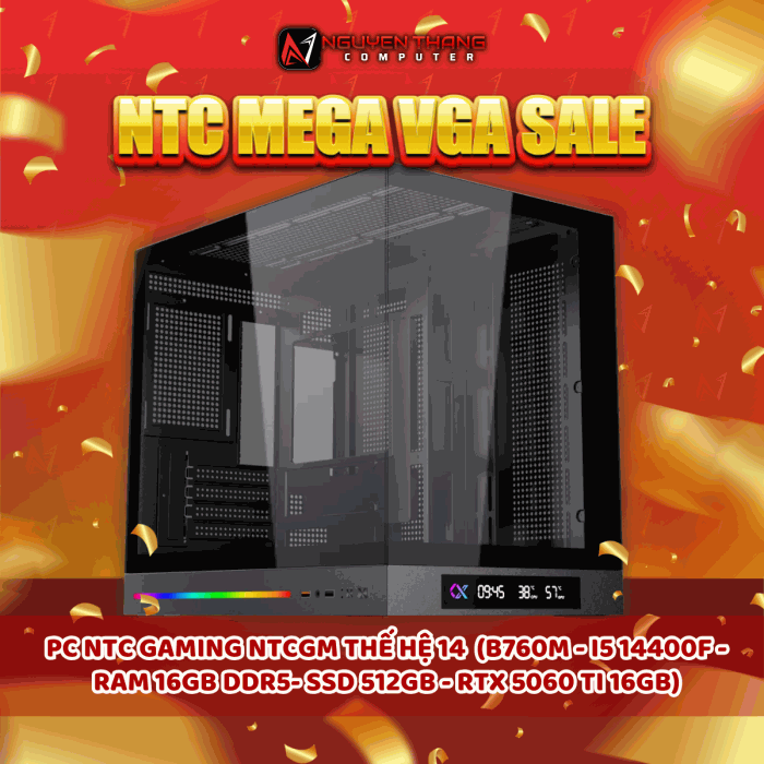 PC NTC Gaming NTCGM thế hệ 14 (B760 – i5 14400F – 16GB – 512GB NVMe – RTX 5060 Ti 16GB) mang đến hiệu năng mạnh mẽ cho game thủ và người dùng sáng tạo nội dung. Sự kết hợp giữa CPU Intel Core i5 thế hệ 14, RAM 16GB từ thương hiệu Corsair danh tiếng, ổ cứng NVMe 512GB cùng card đồ họa RTX 5060 Ti 16GB giúp xử lý mượt mà mọi tựa game AAA, livestream và đồ họa 3D chuyên nghiệp. Đây là cấu hình gaming – làm việc tối ưu trong tầm giá.