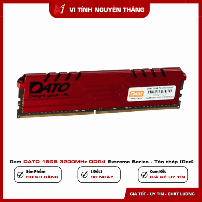RAM DATO 16GB 3200MHz DDR4 Extreme Series – Tản thép (Red) là lựa chọn phù hợp cho các cấu hình PC văn phòng nâng cao hoặc gaming phổ thông. Sản phẩm sở hữu dung lượng 16GB, tốc độ 3200MHz chuẩn JEDEC, điện áp thấp 1.2V, thiết kế tản thép chắc chắn và bảo hành 36 tháng, đáp ứng tốt cả hiệu năng lẫn độ ổn định lâu dài.