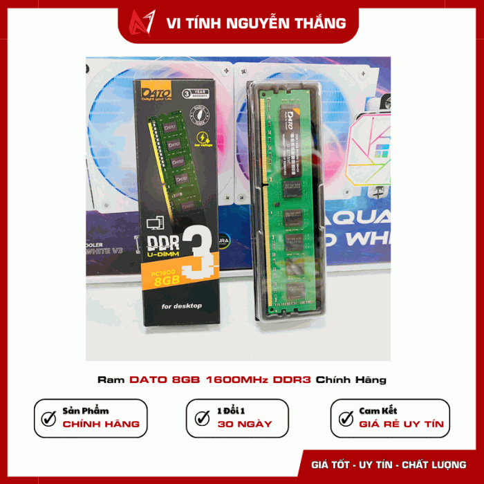 RAM DATO 8GB 1600MHz DDR3 Chính Hãng là lựa chọn hợp lý cho người dùng đang sử dụng nền tảng DDR3 và muốn nâng cấp hiệu năng với chi phí tối ưu. Dung lượng 8GB đáp ứng tốt nhu cầu phổ thông, bus 1600MHz ổn định và chế độ bảo hành 36 tháng mang lại sự an tâm lâu dài.