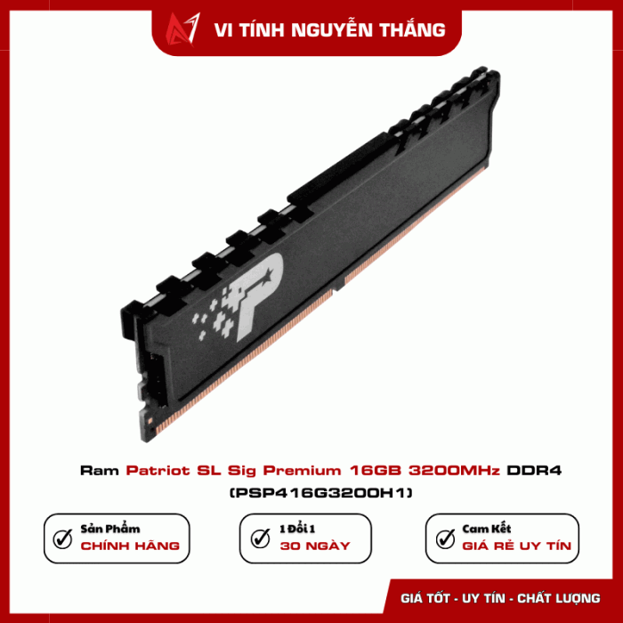 RAM Patriot SL Sig Premium 16GB 3200MHz DDR4 (PSP416G3200H1) là lựa chọn hợp lý cho người dùng cần nâng cấp RAM dung lượng lớn, hoạt động ổn định, tương thích tốt với Intel và AMD, đi kèm chế độ bảo hành dài hạn. Phù hợp cho PC làm việc, học tập và giải trí.