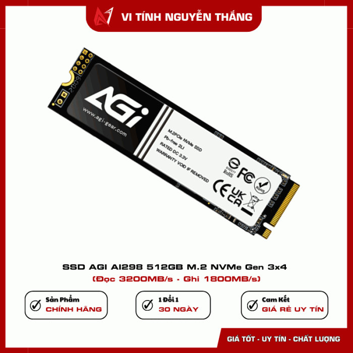 SSD AGI AI298 512GB M.2 NVMe Gen 3x4 là lựa chọn phù hợp cho người dùng muốn nâng cấp hiệu năng hệ thống với chi phí hợp lý. Tốc độ đọc 3200MB/s, ghi 1800MB/s cùng công nghệ 3D NAND giúp tăng tốc đáng kể cho PC và laptop.