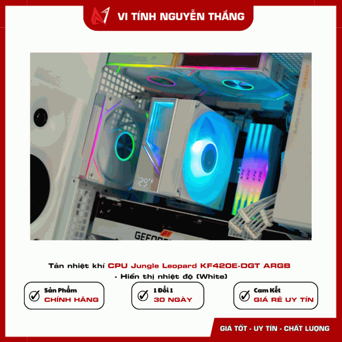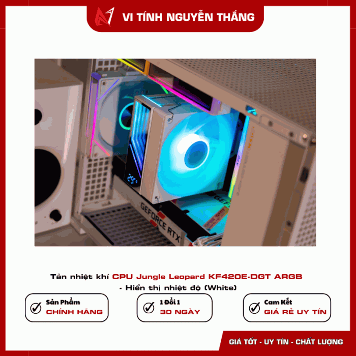 Jungle Leopard KF420E-DGT ARGB là bộ tản nhiệt khí CPU được thiết kế dành cho các hệ thống máy tính hiệu năng cao cần khả năng làm mát ổn định và thẩm mỹ hiện đại. Sản phẩm sở hữu thiết kế màu trắng tinh tế kết hợp hệ thống LED ARGB nổi bật, giúp nâng tầm vẻ đẹp cho dàn PC gaming hoặc workstation.