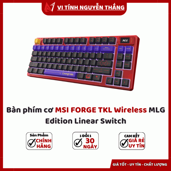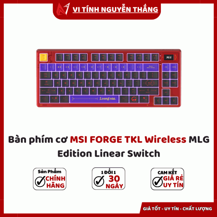 Trong thế giới gaming, bàn phím cơ không chỉ là công cụ nhập liệu mà còn là “vũ khí” quyết định tốc độ và trải nghiệm chơi game. MSI FORGE TKL Wireless MLG Edition với switch cơ học tuyến tính KTT Purple Star Linear mang đến cảm giác gõ mượt mà, độ bền vượt trội và khả năng kết nối linh hoạt. Đây là dòng bàn phím gaming TKL (Tenkeyless) hiện đại, được thiết kế cho game thủ chuyên nghiệp và người dùng yêu thích sự gọn gàng nhưng vẫn mạnh mẽ.