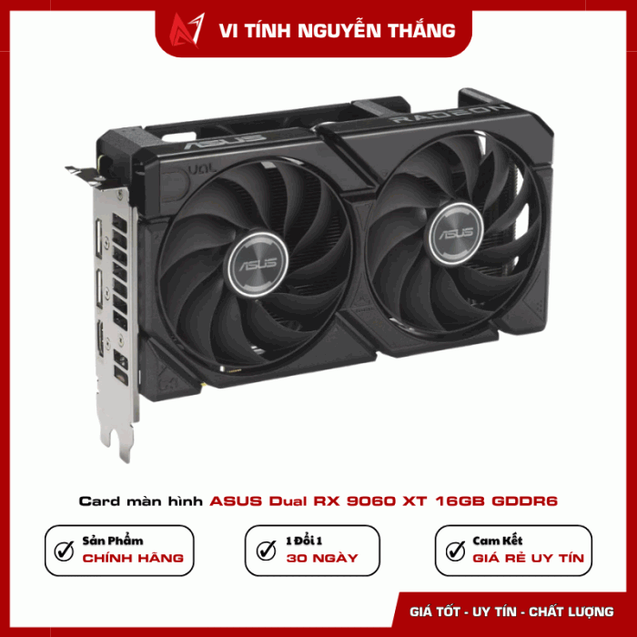 Card màn hình ASUS Dual RX 9060 XT 16GB GDDR6 là dòng VGA thế hệ mới hướng đến người dùng cần hiệu năng cao cho gaming hiện đại và các tác vụ đồ họa chuyên sâu. Sản phẩm được xây dựng dựa trên nền tảng GPU Radeon RX 9000 series, mang lại khả năng xử lý mạnh mẽ cùng nhiều cải tiến về hiệu suất.