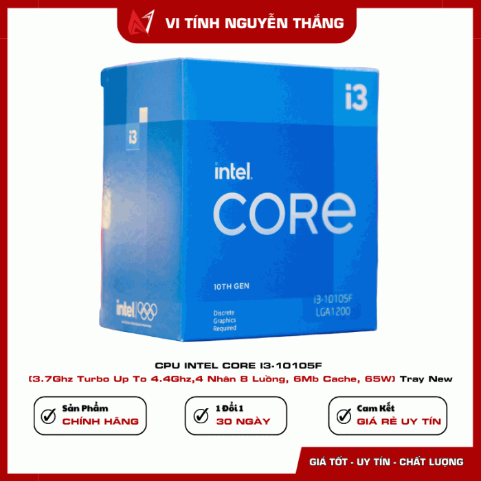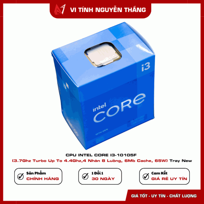 Intel Core i3-10105F là bộ vi xử lý thuộc dòng Core i thế hệ thứ 10, hướng đến người dùng phổ thông cần hiệu năng ổn định cho gaming, làm việc văn phòng, học tập và giải trí. Với 4 nhân 8 luồng cùng xung nhịp cao, i3-10105F vẫn đáp ứng tốt nhiều tác vụ hiện nay.