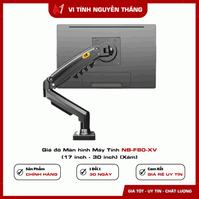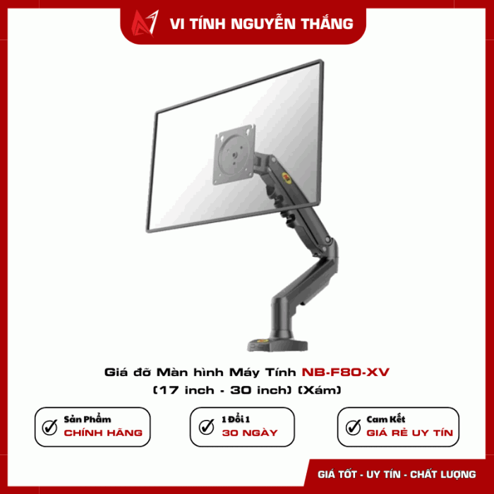 Giá đỡ NB-F80-XV tương thích với màn hình từ 17 đến 30 inch cùng tải trọng tối đa 9kg. Điều này giúp người dùng có thể dễ dàng lắp đa dạng màn hình văn phòng, gaming hoặc màn hình đồ họa cơ bản.
