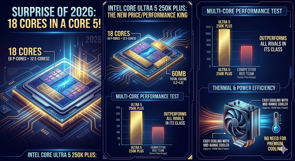 Được đánh giá là bất ngờ lớn nhất năm 2026, 250K Plus sở hữu tới 18 nhân – một con số chưa từng thấy ở phân khúc Core 5 trước đây.