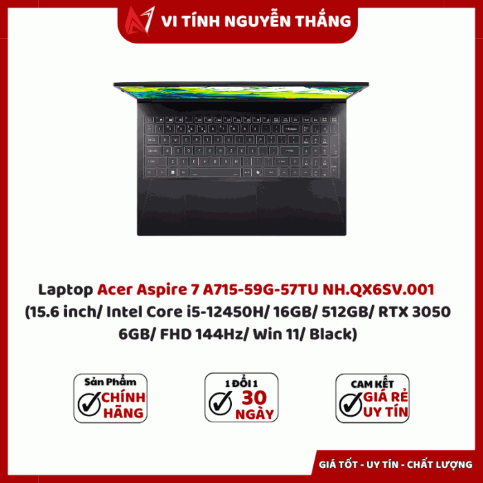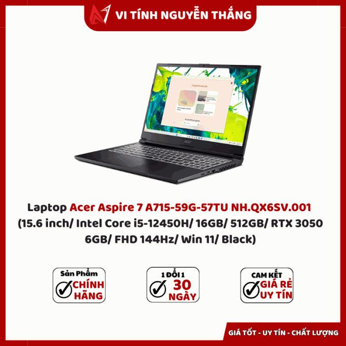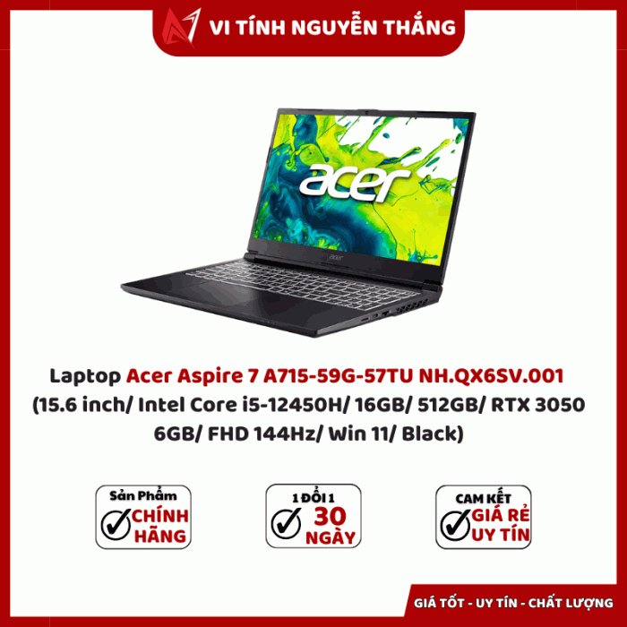 Laptop Acer Aspire 7 A715-59G-57TU NH.QX6SV.001 (15.6 inch/ Intel Core i5-12450H/ 16GB/ 512GB/ RTX 3050 6GB/ FHD 144Hz/ Win 11/ Black)