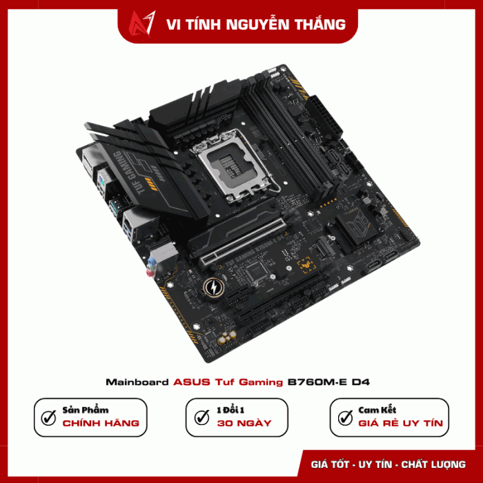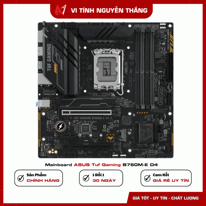 ASUS TUF Gaming B760M-E D4 là lựa chọn tối ưu cho game thủ, người làm việc văn phòng và sáng tạo nội dung cần một main bền bỉ, hiệu năng tốt và giá phải chăng. Với thiết kế chuẩn quân đội, hỗ trợ PCIe 5.0, 2 khe M.2 tốc độ cao và khả năng tương thích rộng, chiếc mainboard này mang đến một cấu hình mạnh mẽ – ổn định – tiết kiệm, phù hợp để build PC gaming hoặc workstation trong tầm giá dưới 4 triệu.