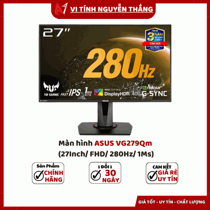Asus VG279QM là màn hình gaming cao cấp thuộc dòng ROG nổi tiếng, được thiết kế dành riêng cho game thủ chuyên nghiệp yêu cầu tốc độ, độ mượt và màu sắc trung thực. Với tần số quét lên đến 280Hz, thời gian phản hồi 1ms cùng công nghệ G-Sync/FreeSync, sản phẩm mang lại trải nghiệm hình ảnh siêu mượt, không xé hình và không giật lag – giúp bạn luôn dẫn đầu trong mọi trận chiến.