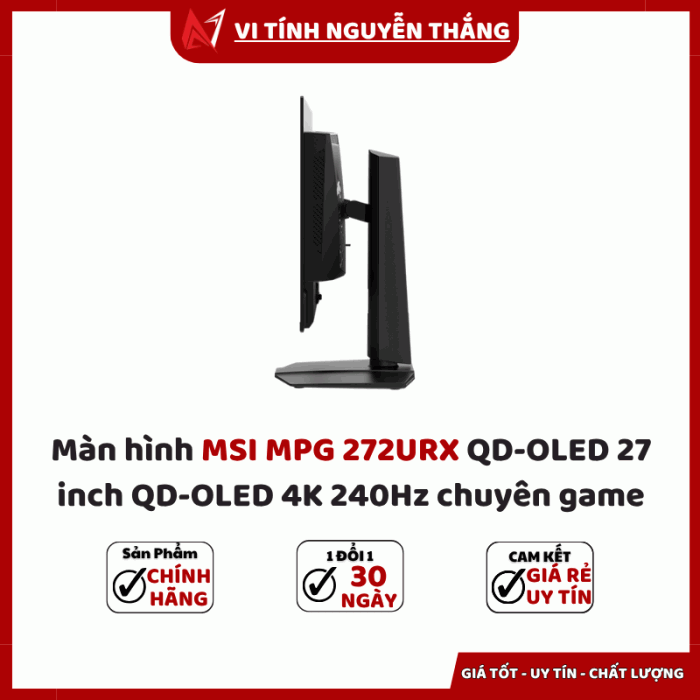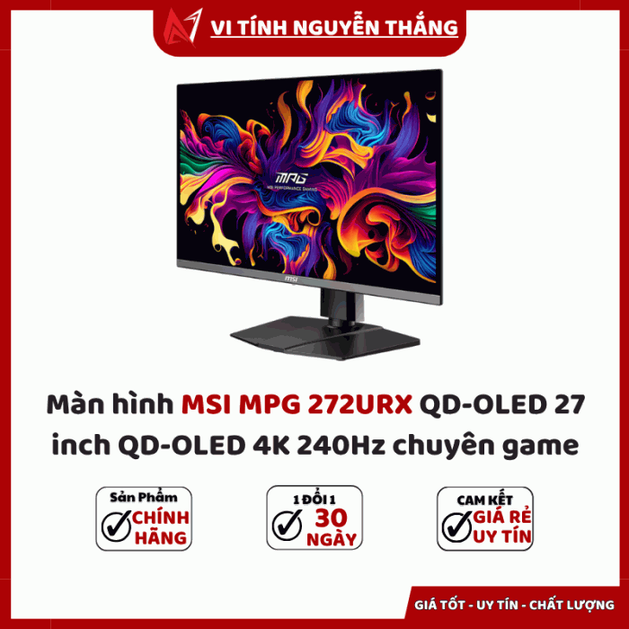 Màn hình MSI MPG 272URX QD-OLED là siêu phẩm mới trong dòng màn hình gaming cao cấp của MSI, sở hữu tấm nền QD-OLED hiện đại, độ phân giải 4K UHD, cùng tần số quét 240Hz siêu mượt. Với thời gian phản hồi 0.03ms, công nghệ HDR True Black 400 và gam màu rộng gần 100% DCI-P3, sản phẩm này được thiết kế để đáp ứng nhu cầu game thủ eSports chuyên nghiệp, streamer và nhà sáng tạo nội dung.