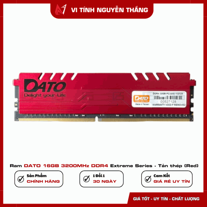RAM DATO 16GB 3200MHz DDR4 Extreme Series – Tản thép (Red) là lựa chọn phù hợp cho các cấu hình PC văn phòng nâng cao hoặc gaming phổ thông. Sản phẩm sở hữu dung lượng 16GB, tốc độ 3200MHz chuẩn JEDEC, điện áp thấp 1.2V, thiết kế tản thép chắc chắn và bảo hành 36 tháng, đáp ứng tốt cả hiệu năng lẫn độ ổn định lâu dài.