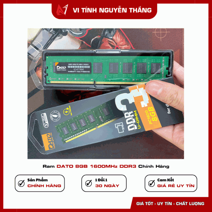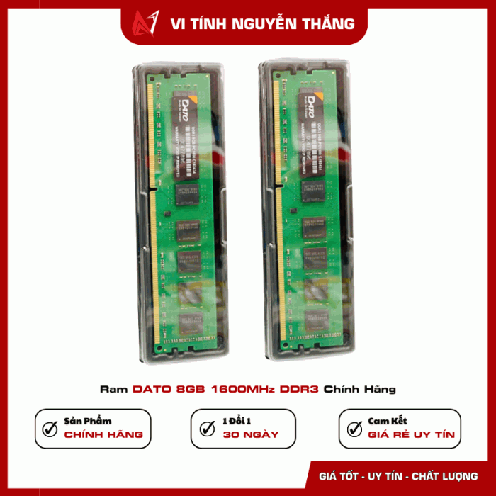 RAM DATO 8GB 1600MHz DDR3 Chính Hãng là lựa chọn hợp lý cho người dùng đang sử dụng nền tảng DDR3 và muốn nâng cấp hiệu năng với chi phí tối ưu. Dung lượng 8GB đáp ứng tốt nhu cầu phổ thông, bus 1600MHz ổn định và chế độ bảo hành 36 tháng mang lại sự an tâm lâu dài.