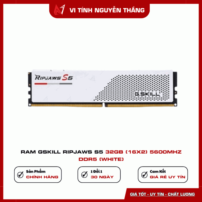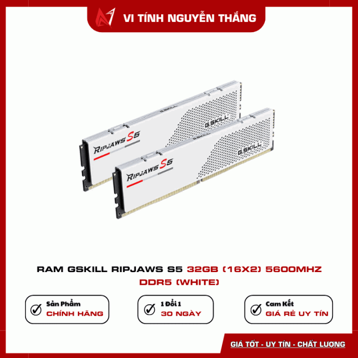 RAM G.Skill Ripjaws S5 32GB 5600MHz DDR5 White mang đến sự cân bằng hoàn hảo giữa hiệu năng, thiết kế và độ bền – lựa chọn tối ưu cho các bộ PC thế hệ mới.