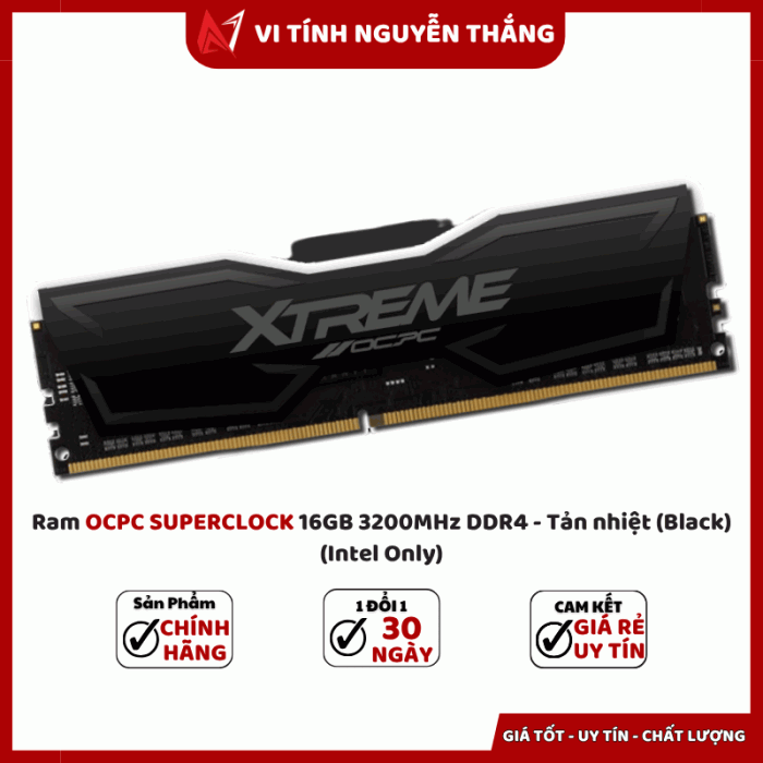 RAM OCPC SUPERCLOCK 16GB DDR4 3200MHz là dòng bộ nhớ tầm trung được thiết kế chuyên biệt cho các hệ thống sử dụng CPU Intel. Với tốc độ bus lên tới 3200MHz cùng thiết kế tản nhiệt màu đen nổi bật, sản phẩm mang lại hiệu suất ổn định, phù hợp cho cả nhu cầu làm việc lẫn chơi game.