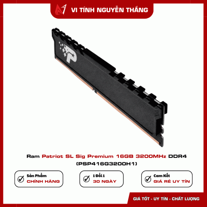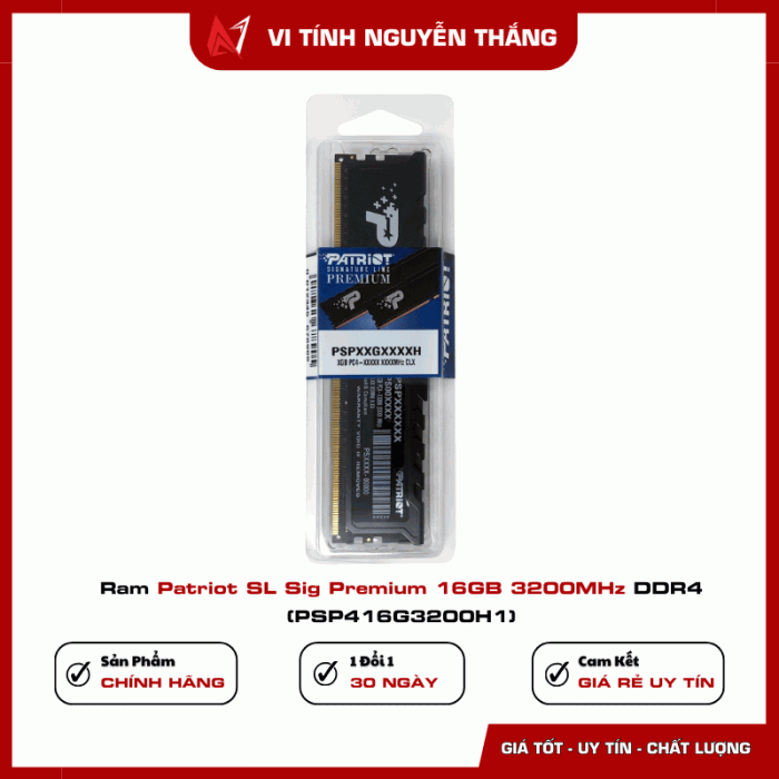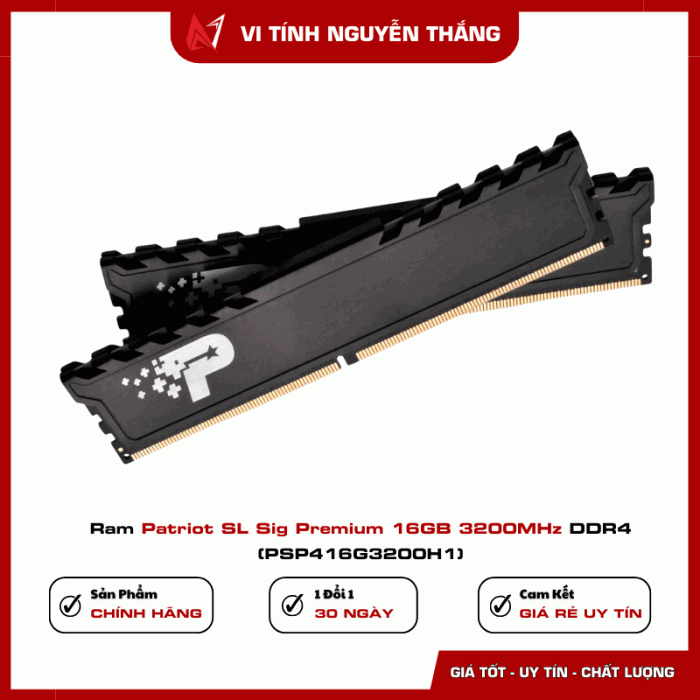 RAM Patriot SL Sig Premium 16GB 3200MHz DDR4 (PSP416G3200H1) là lựa chọn hợp lý cho người dùng cần nâng cấp RAM dung lượng lớn, hoạt động ổn định, tương thích tốt với Intel và AMD, đi kèm chế độ bảo hành dài hạn. Phù hợp cho PC làm việc, học tập và giải trí.