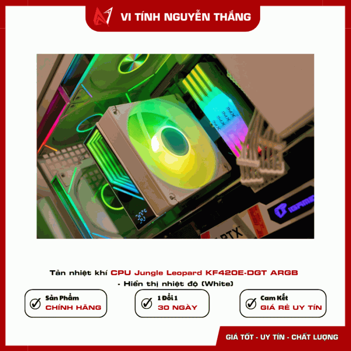 Jungle Leopard KF420E-DGT ARGB là bộ tản nhiệt khí CPU được thiết kế dành cho các hệ thống máy tính hiệu năng cao cần khả năng làm mát ổn định và thẩm mỹ hiện đại. Sản phẩm sở hữu thiết kế màu trắng tinh tế kết hợp hệ thống LED ARGB nổi bật, giúp nâng tầm vẻ đẹp cho dàn PC gaming hoặc workstation.